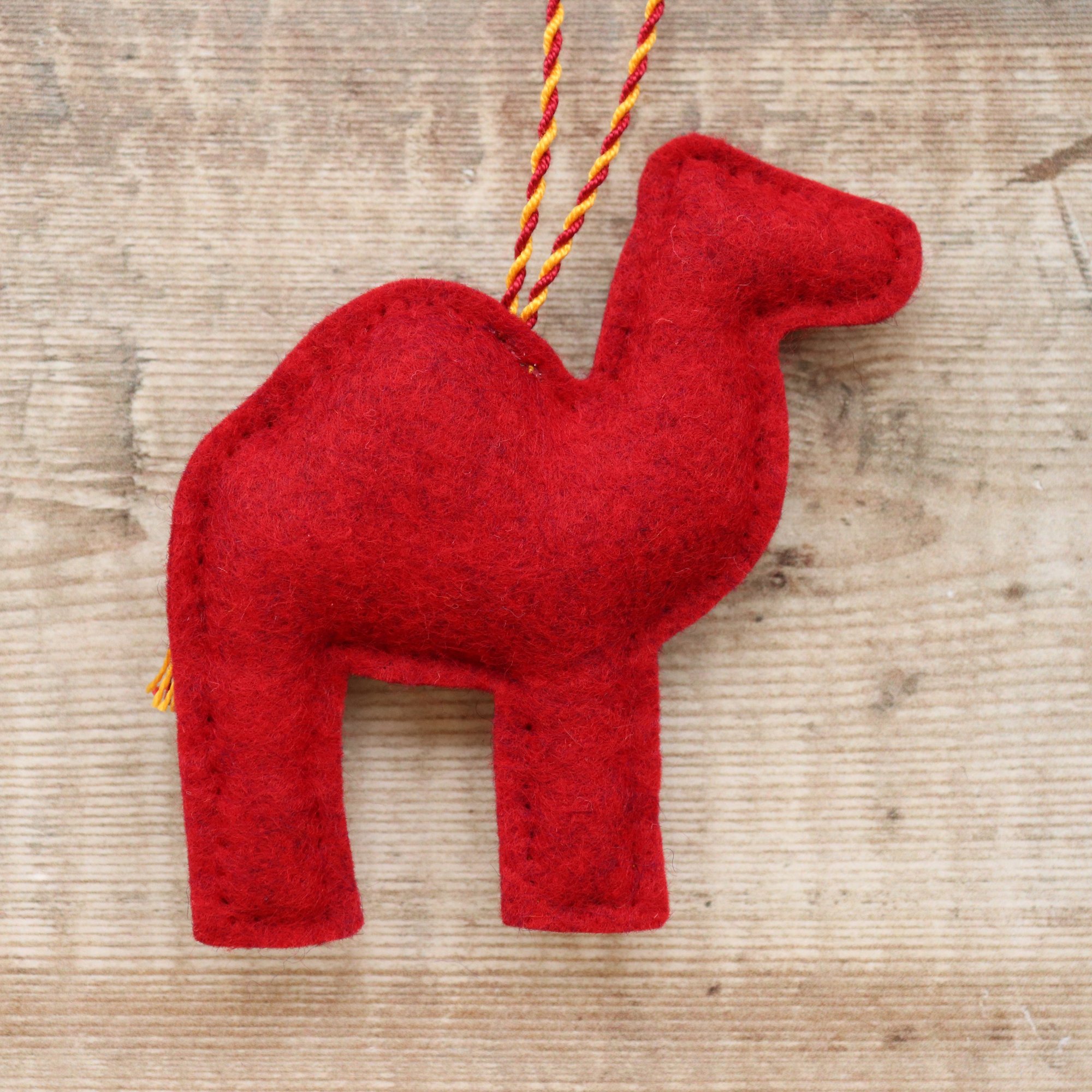 For sale here is a handmade felt camel decoration. He has been created using quality wool/ viscose blend felt in bold folk art inspired colours, and embellished with hand-cut applique pieces, hand embroidery, beads and sequins. He is stuffed to give a nice padded look, backed with deep red felt (it is a little more of a deep, plum red than it looks in the photograph) and measures approximately 9.5cm tall by 9cm wide.