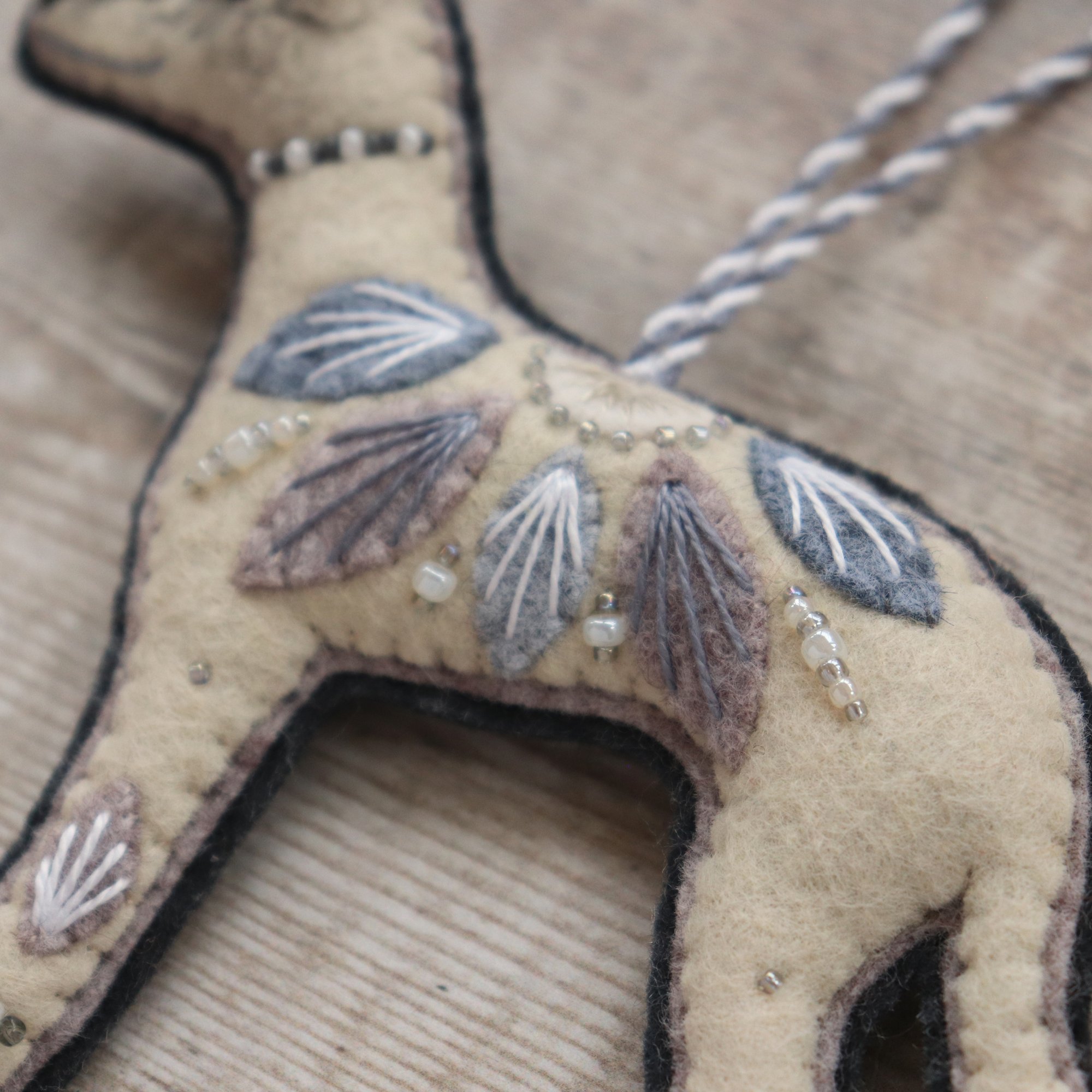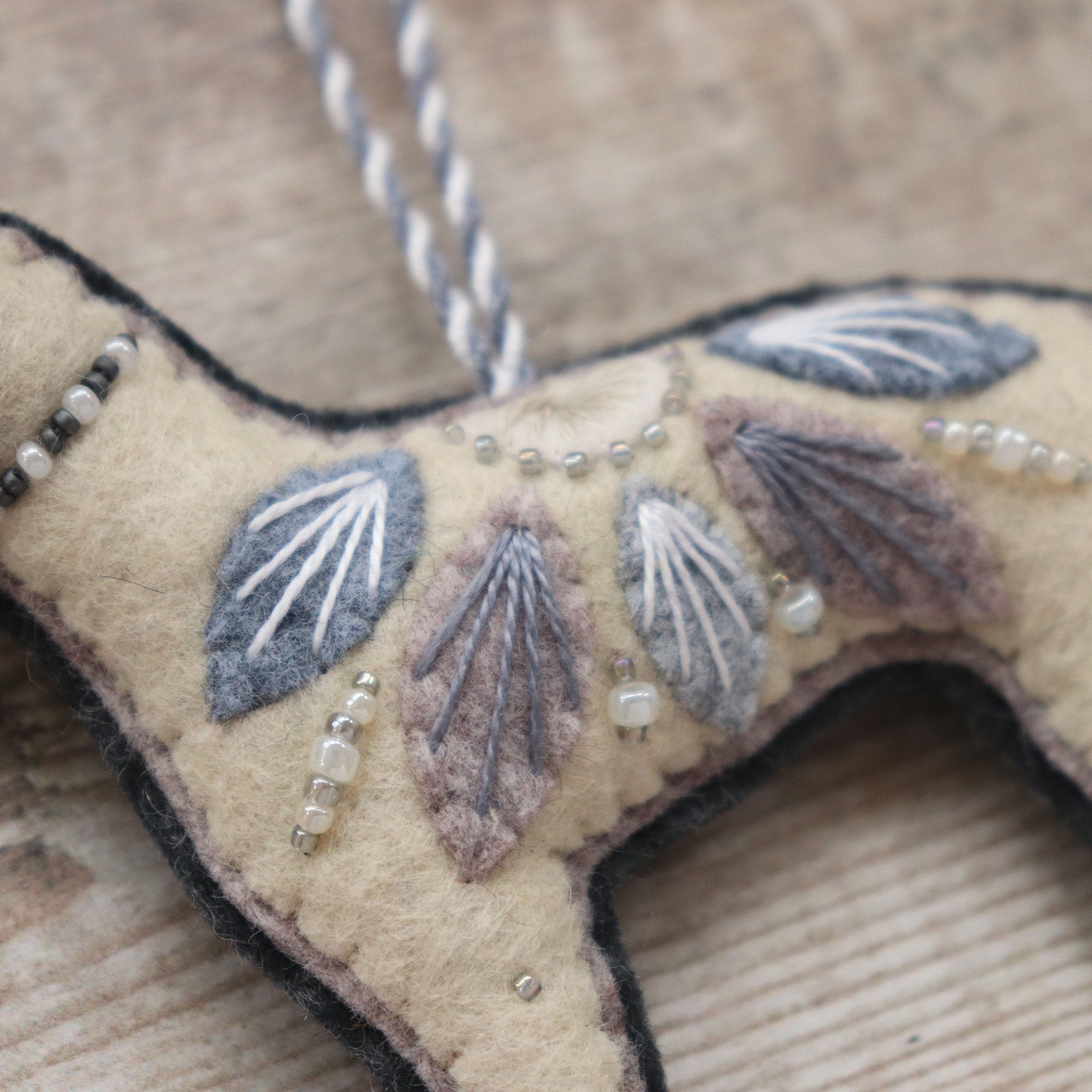For sale here is a handmade felt whippet decoration. He has been created using quality wool/ viscose blend felt, and embellished with hand-cut applique pieces, hand embroidery and beads, along with a little carefully dry brushed acrylic paint on his face. He is stuffed to give a nice padded look, backed with dark charcoal grey felt, and measures approximately 10cm tall and 12.5cm wide.