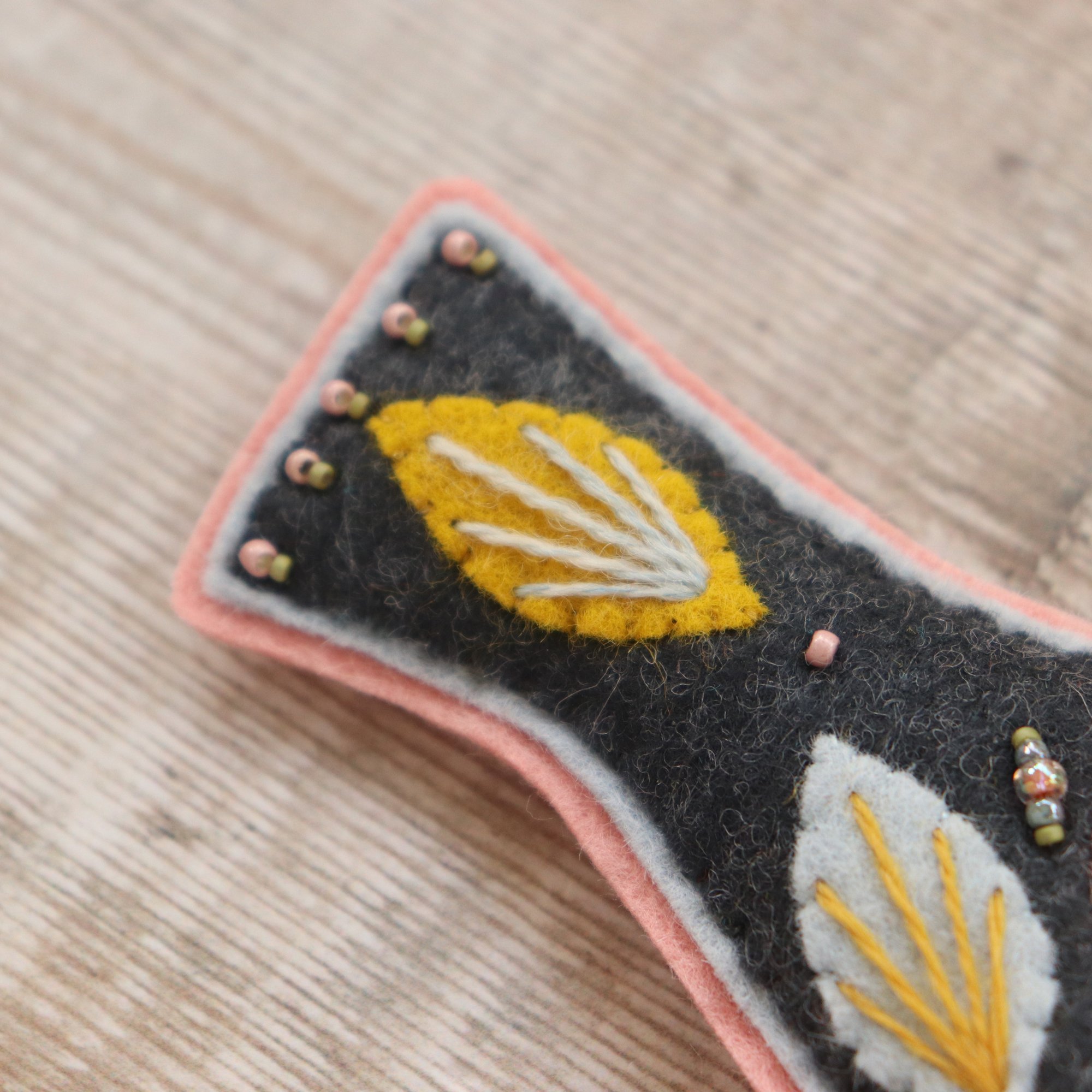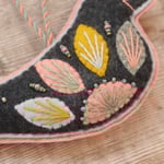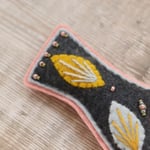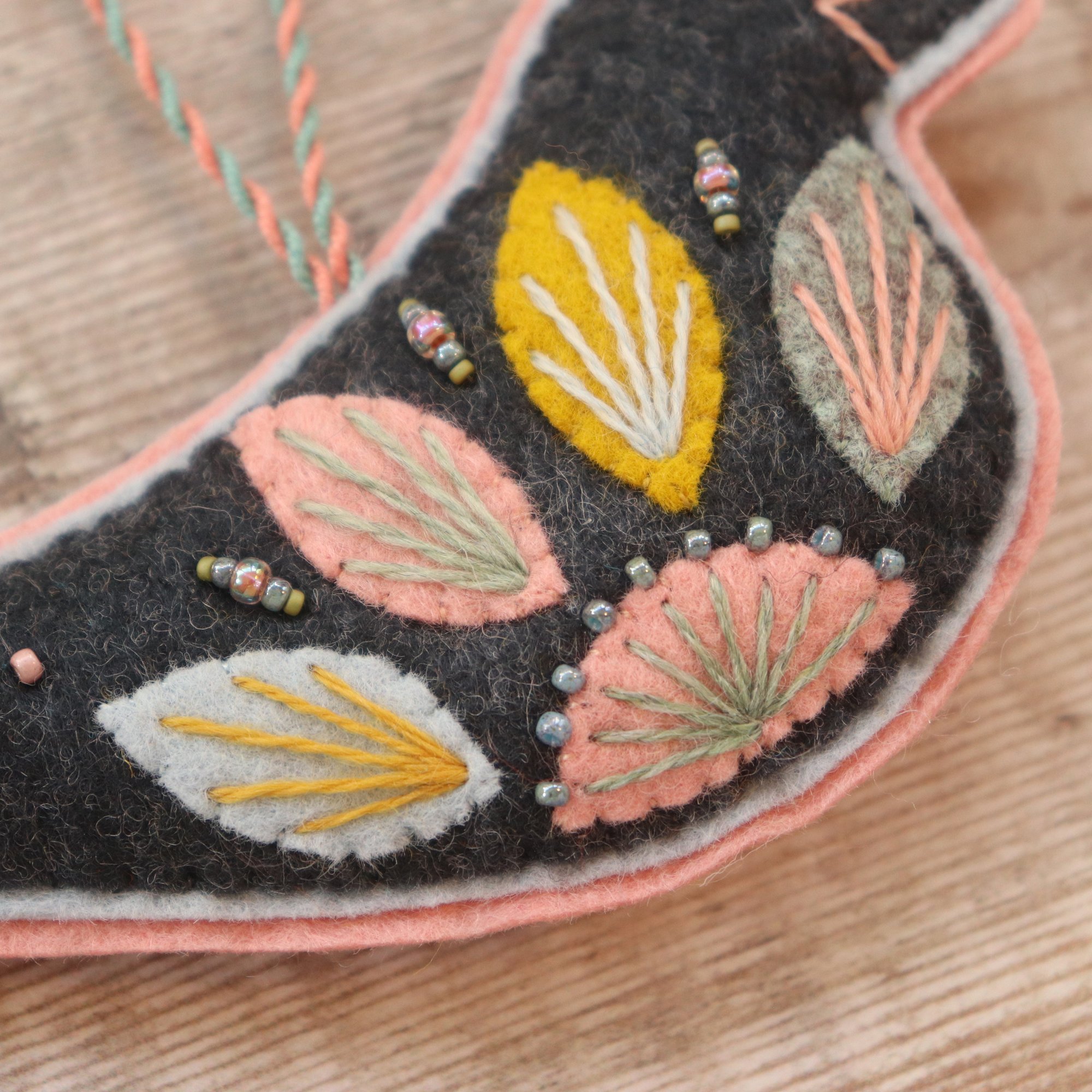 For sale here is a handmade felt bird decoration. She has been created using quality wool/ viscose blend felt in soft floral colours on a charcoal base, and embellished with hand-cut applique pieces, hand embroidery and beads. She is stuffed to give a nice padded look, backed with pink felt, and measures approximately 6.5cm tall and 12.5m wide.