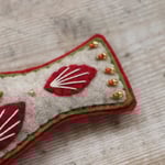 For sale here is a handmade felt bird decoration. She has been created using quality wool and wool/ viscose blend felt, and embellished with hand-cut applique pieces, hand embroidery and beads. She is stuffed to give a nice padded look, backed with deep red felt (deeper, and more plum-like than it looks in the photograph), and measures approximately 13cm long.