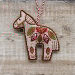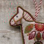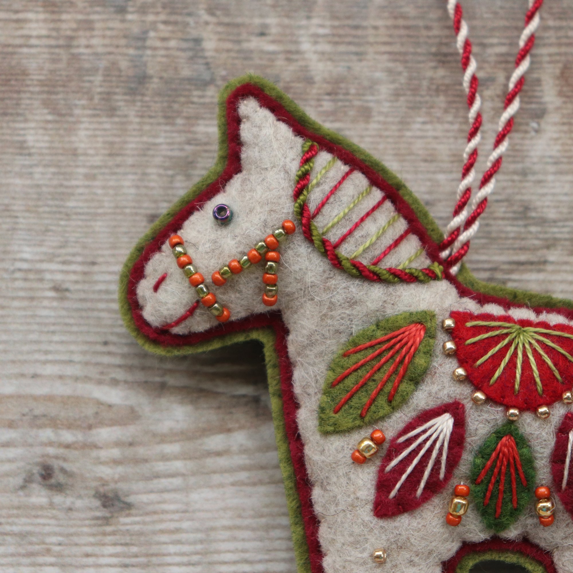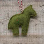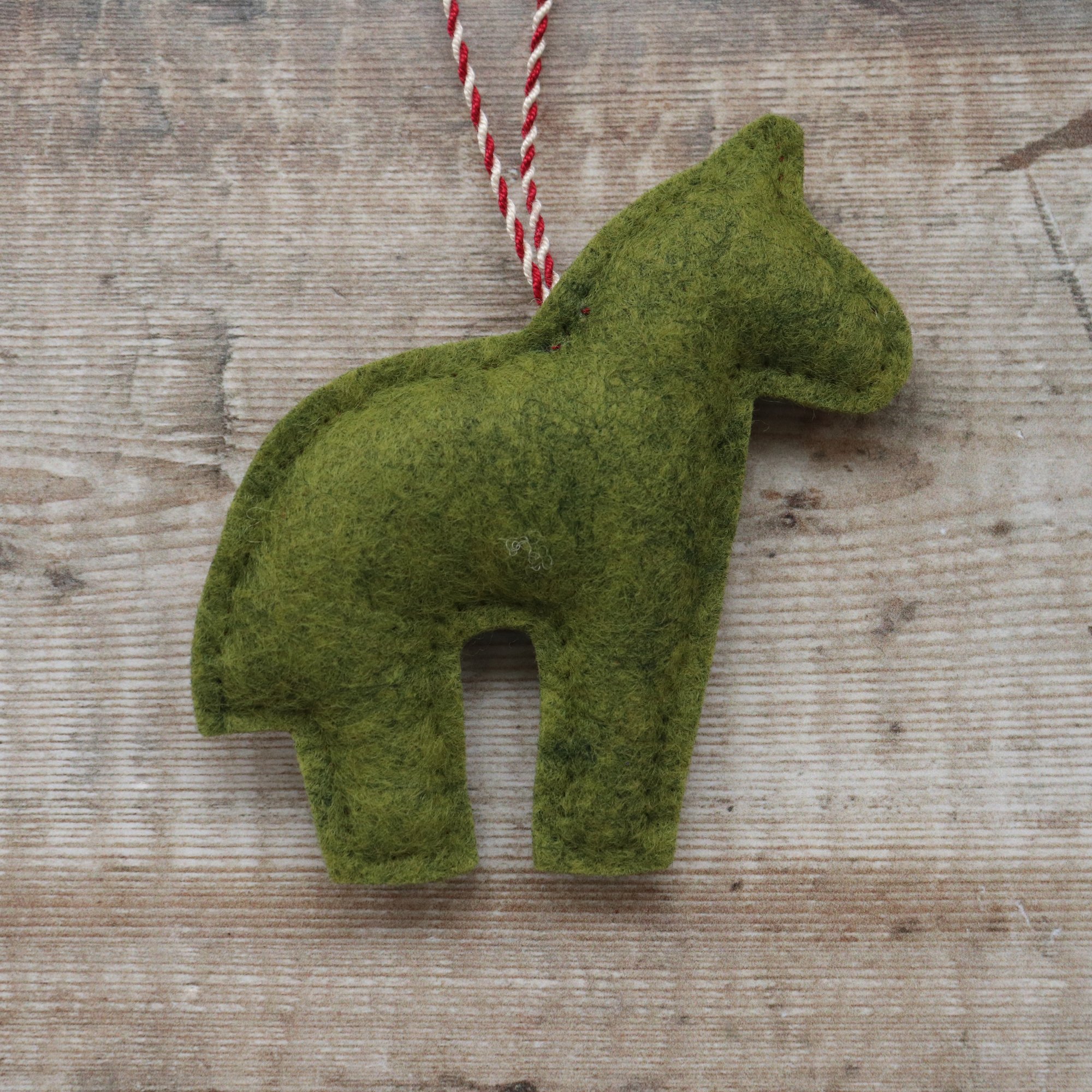 For sale here is a handmade felt horse decoration. He has been created using quality wool and wool/ viscose blend felt, and embellished with hand-cut applique pieces, hand embroidery and beads. He is stuffed to give a nice padded look, backed with green felt, and measures approximately 11cm tall and 9.5cm wide.
