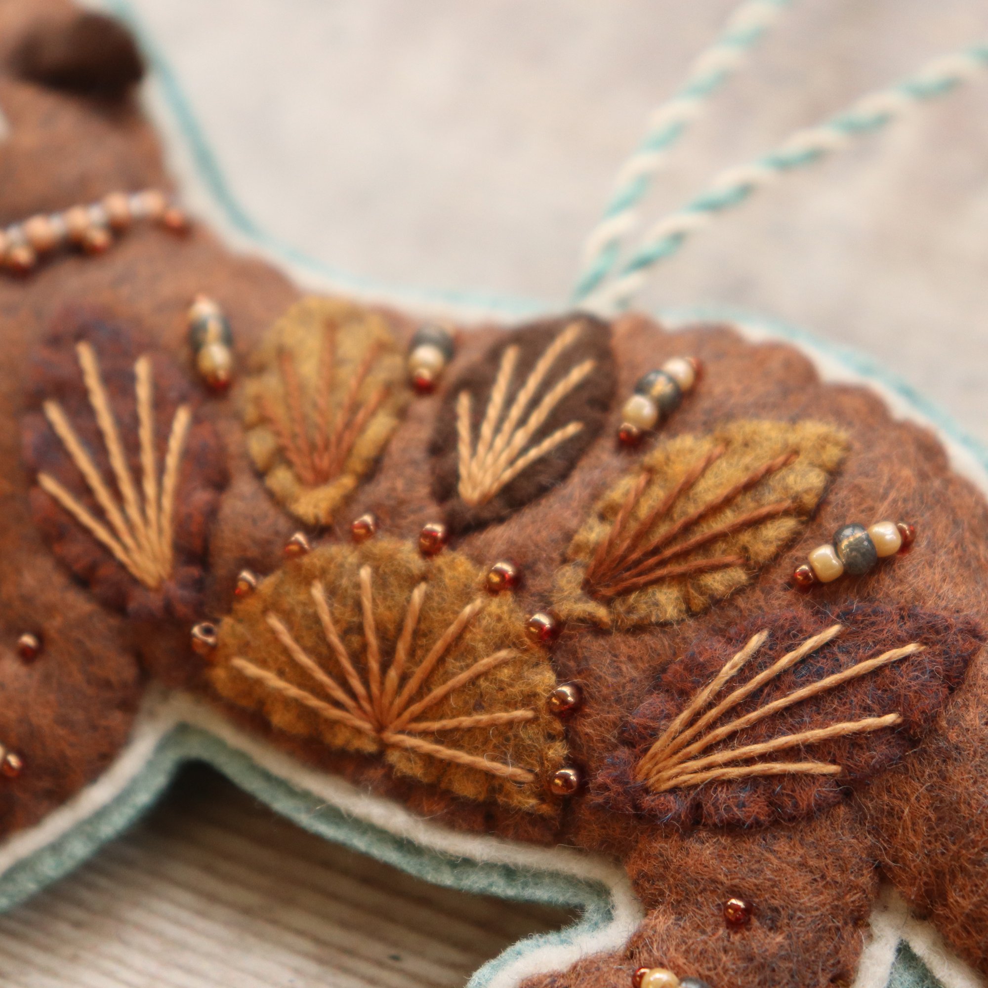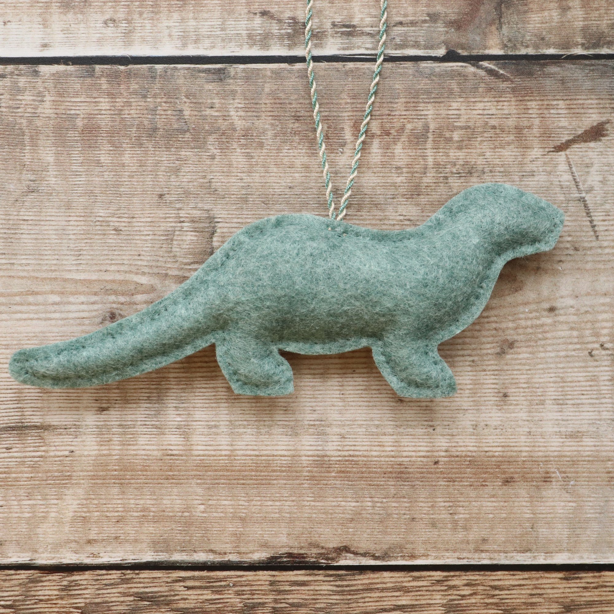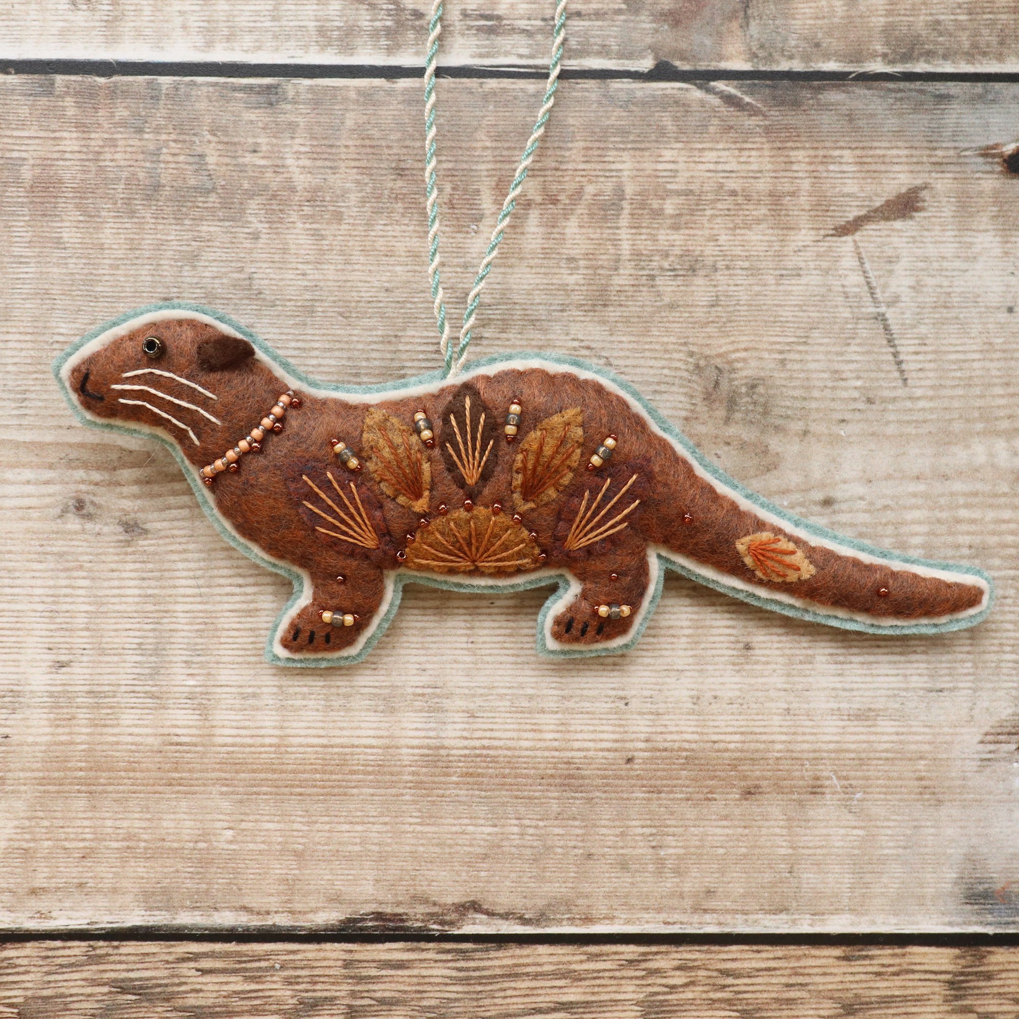 For sale here is a handmade felt otter decoration. He has been created using quality wool/ viscose blend felt, and embellished with hand-cut applique pieces, hand embroidery and beads. He is stuffed to give a nice padded look, backed with subtle teal felt, and measures approximately 17cm long by 7cm tall.