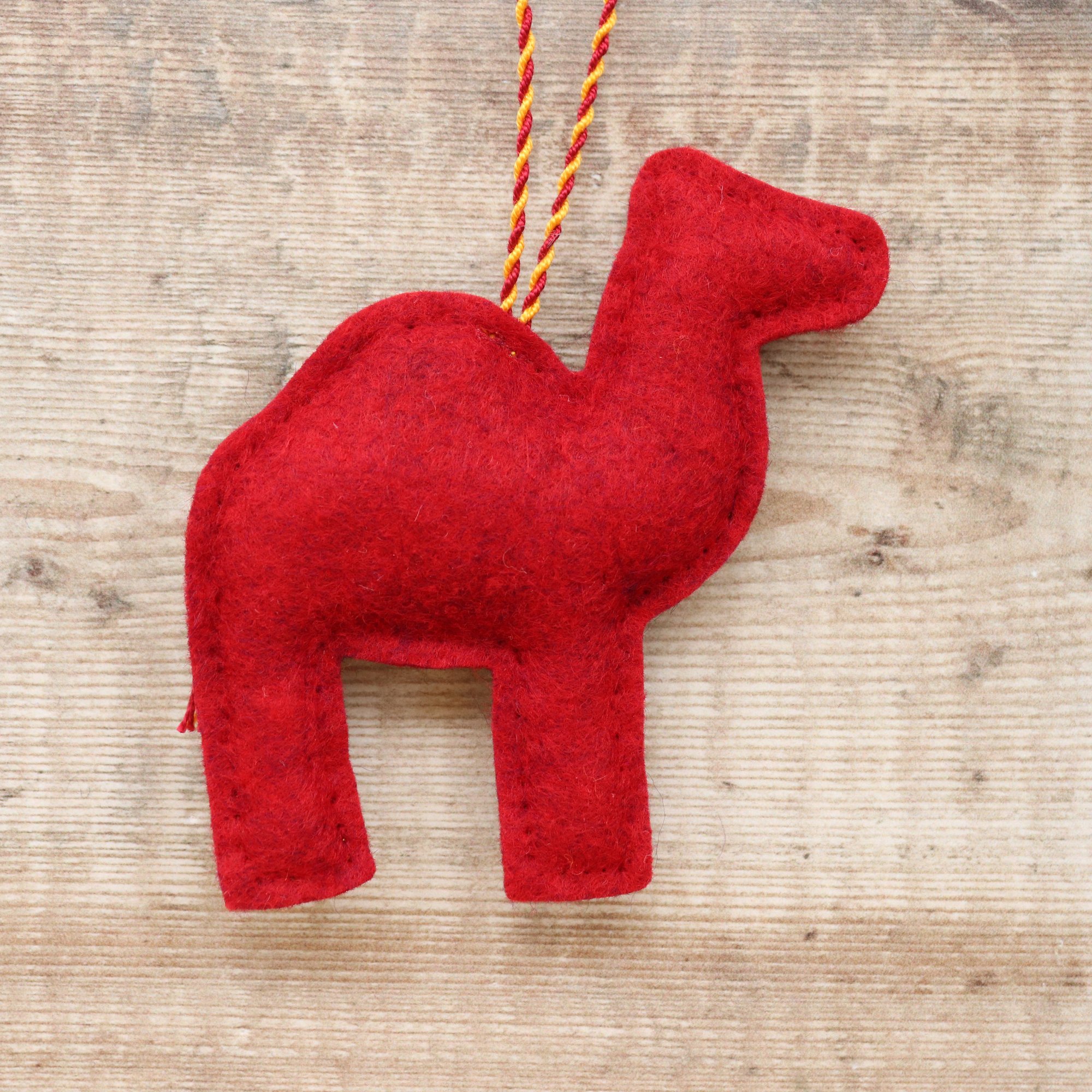 For sale here is a handmade felt camel decoration. He has been created using quality wool/ viscose blend felt in bold folk art inspired colours, and embellished with hand-cut applique pieces, hand embroidery, beads and sequins. He is stuffed to give a nice padded look, backed with deep red felt (it is a little more of a deep, plum red than it looks in the photograph) and measures approximately 9.5cm tall by 9cm wide.