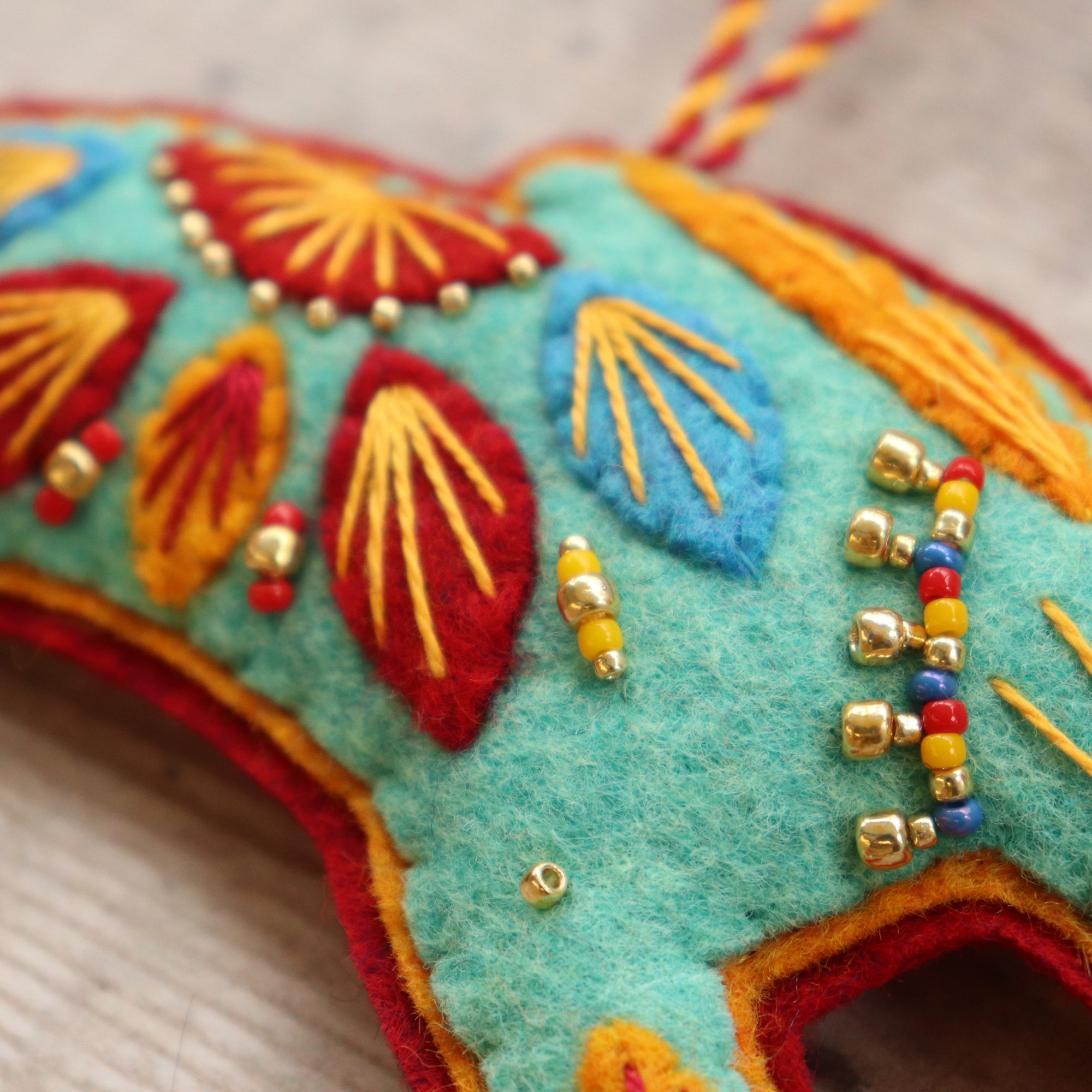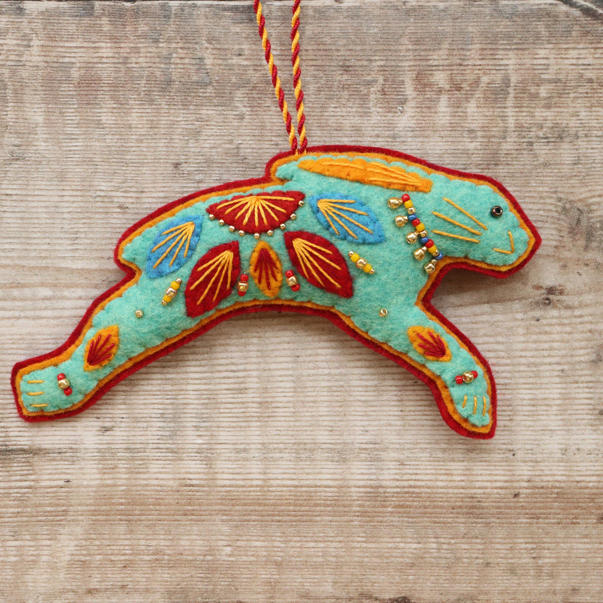 For sale here is a handmade felt hare decoration. He has been created using quality wool/ viscose blend felt in bold folk art inspired colours, and embellished with hand-cut applique pieces, hand embroidery and beads. He is stuffed to give a nice padded look, backed with deep red felt (it is a little more of a deep, plum red than it looks in the photograph) and measures approximately 13.5cm long by 6.5cm tall.