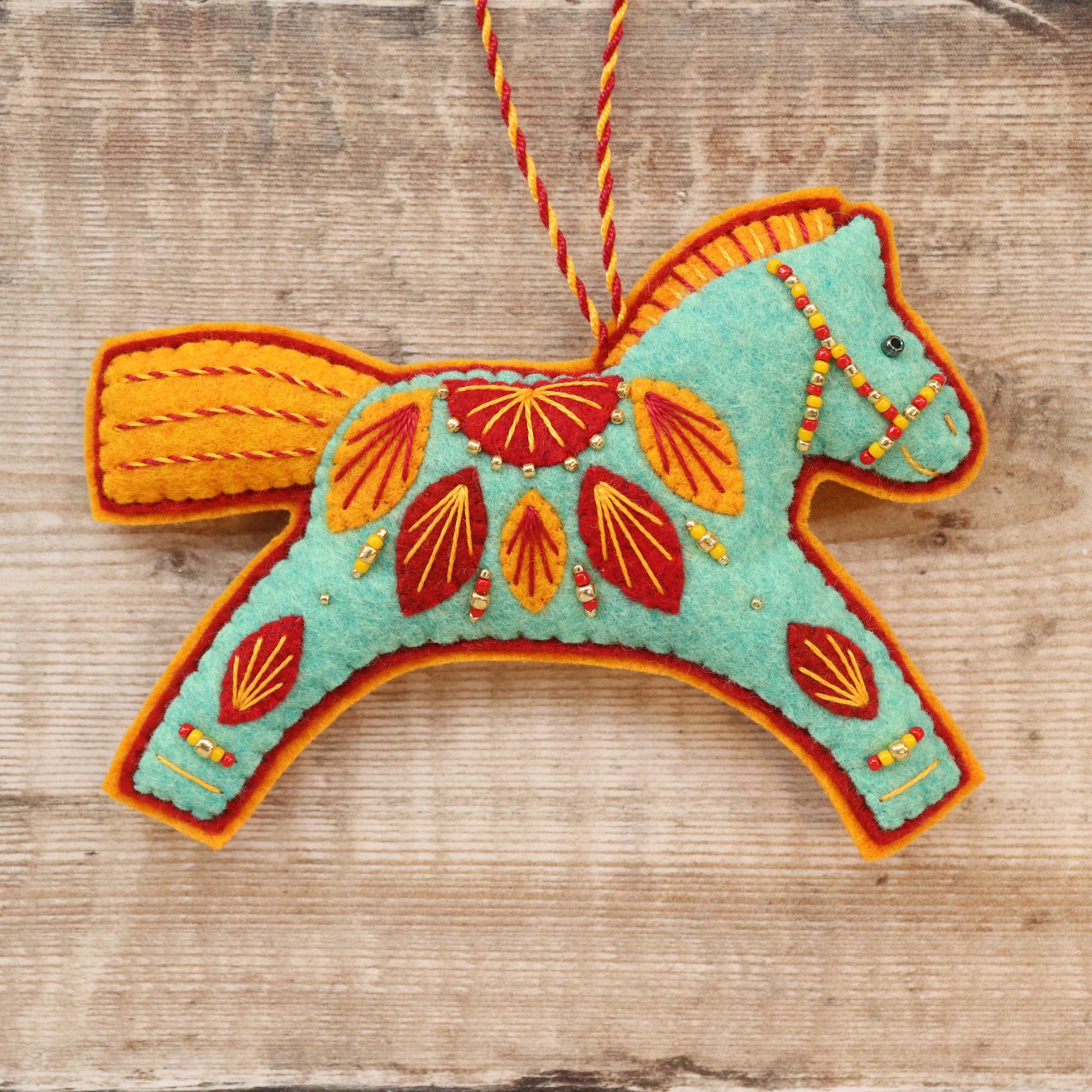 For sale here is a handmade felt leaping pony decoration. He has been created using quality wool/ viscose blend felt in rich folk art inspired colours, and embellished with hand-cut applique pieces, hand embroidery and beads. He is stuffed to give a nice padded look, backed with golden yellow, and measures approximately 13cm long and 9.5cm tall.