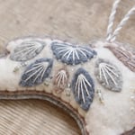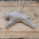 For sale here is a handmade felt hare decoration. She has been created using quality wool/ viscose blend felt in wintry colours, and embellished with hand-cut applique pieces, hand embroidery, sequins and beads. She is stuffed to give a nice padded look, backed with grey felt, and measures approximately 14cm long by 6.5cm tall.
