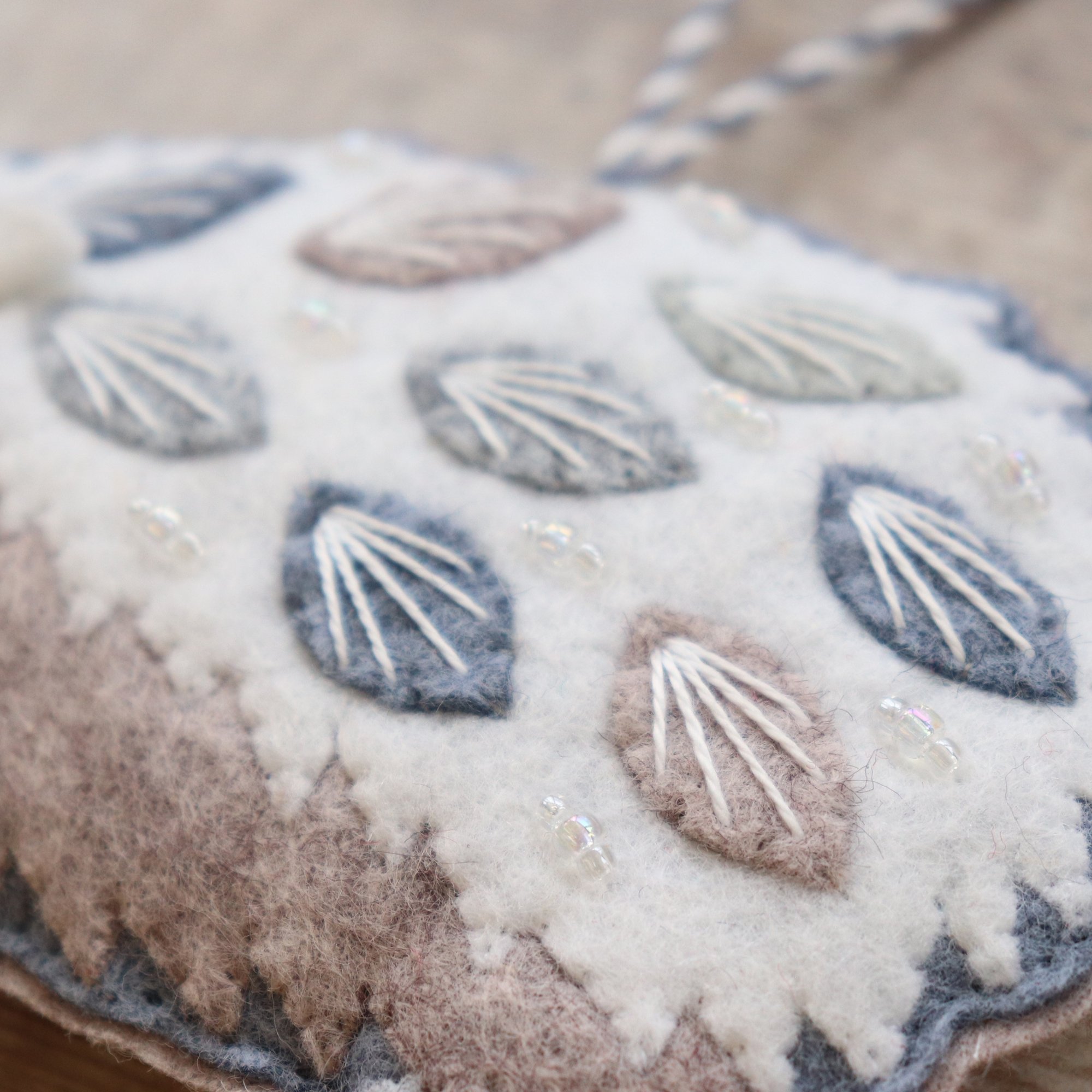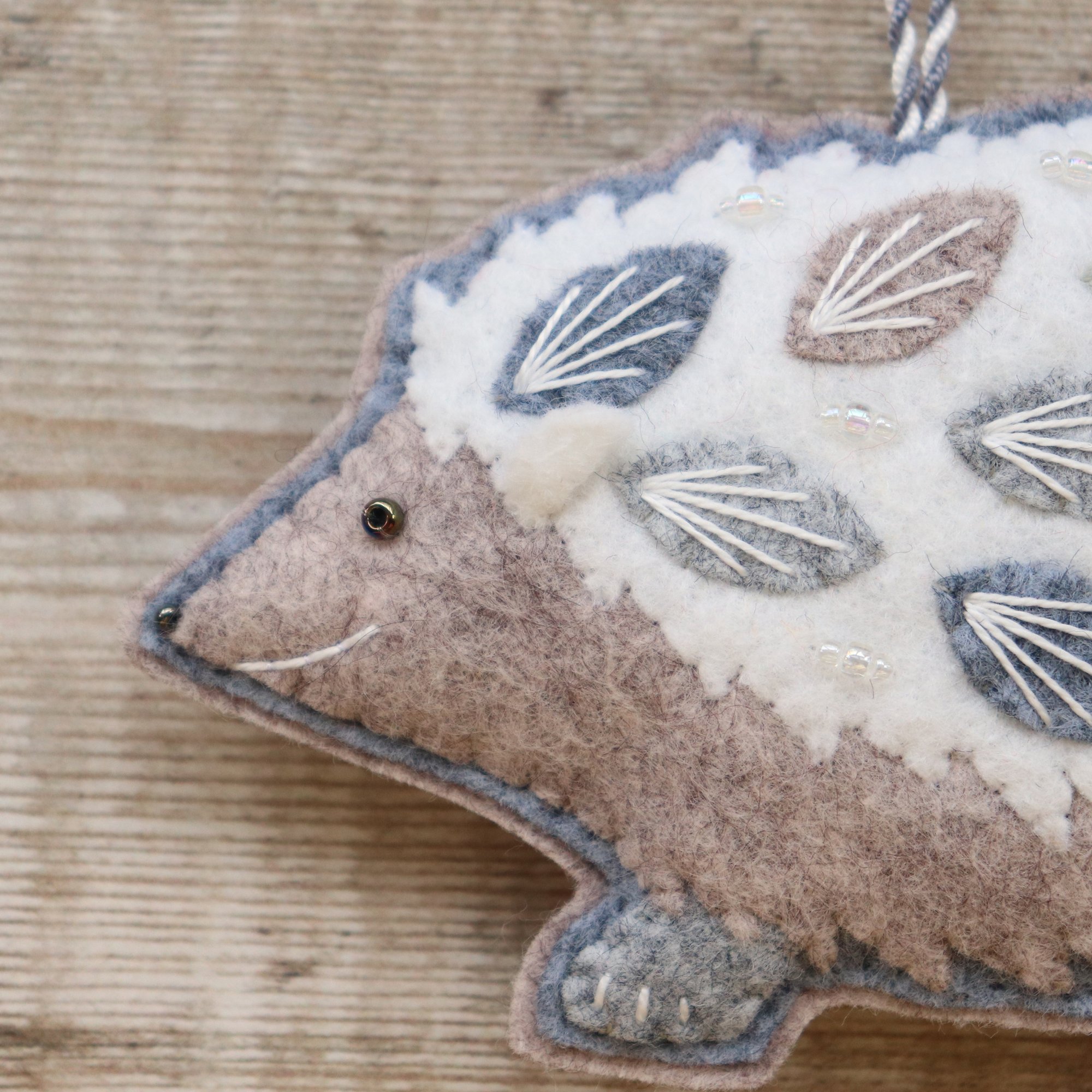 For sale here is a handmade felt hedgehog decoration. He has been created using quality wool/ viscose blend felt in wintry colours, and embellished with hand-cut applique pieces, hand embroidery and beads. He is stuffed to give a nice padded look, backed with grey felt, and measures approximately 11.5cm long by 8.5cm tall.