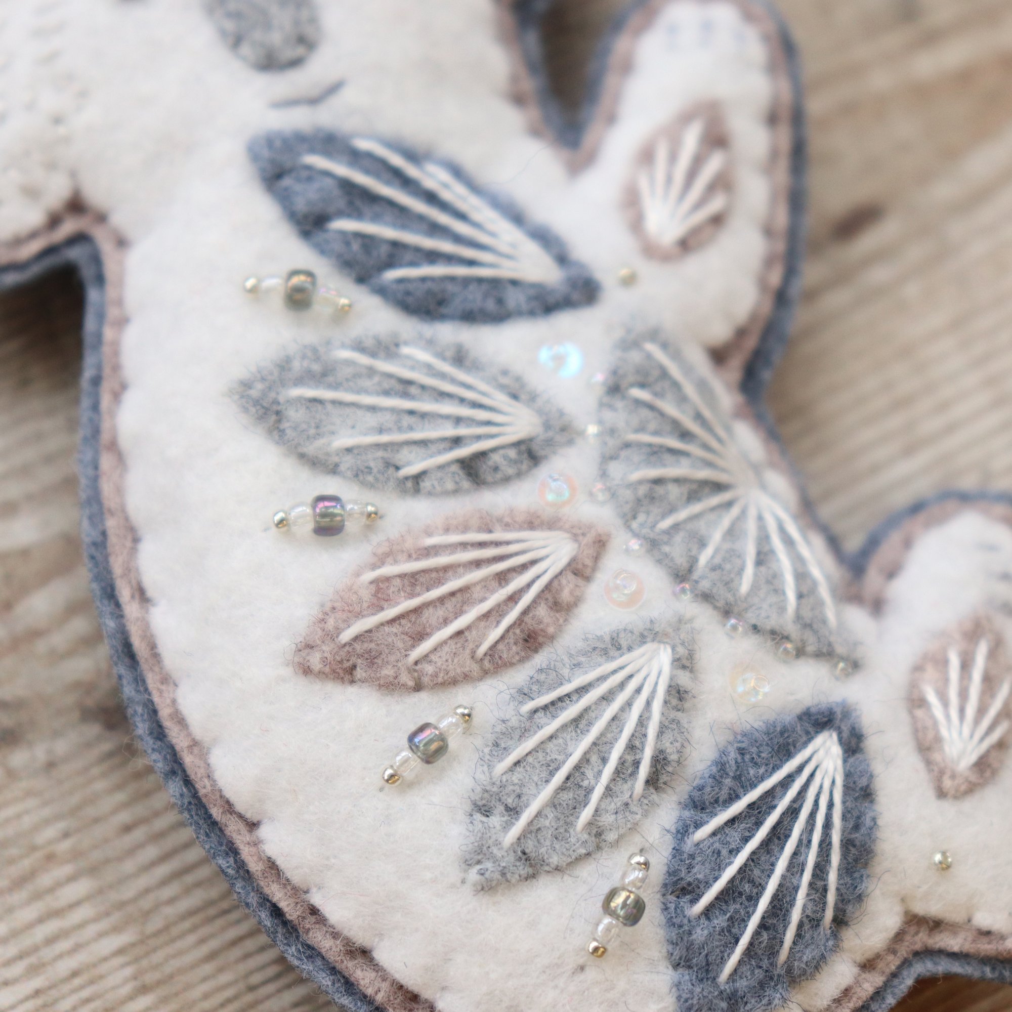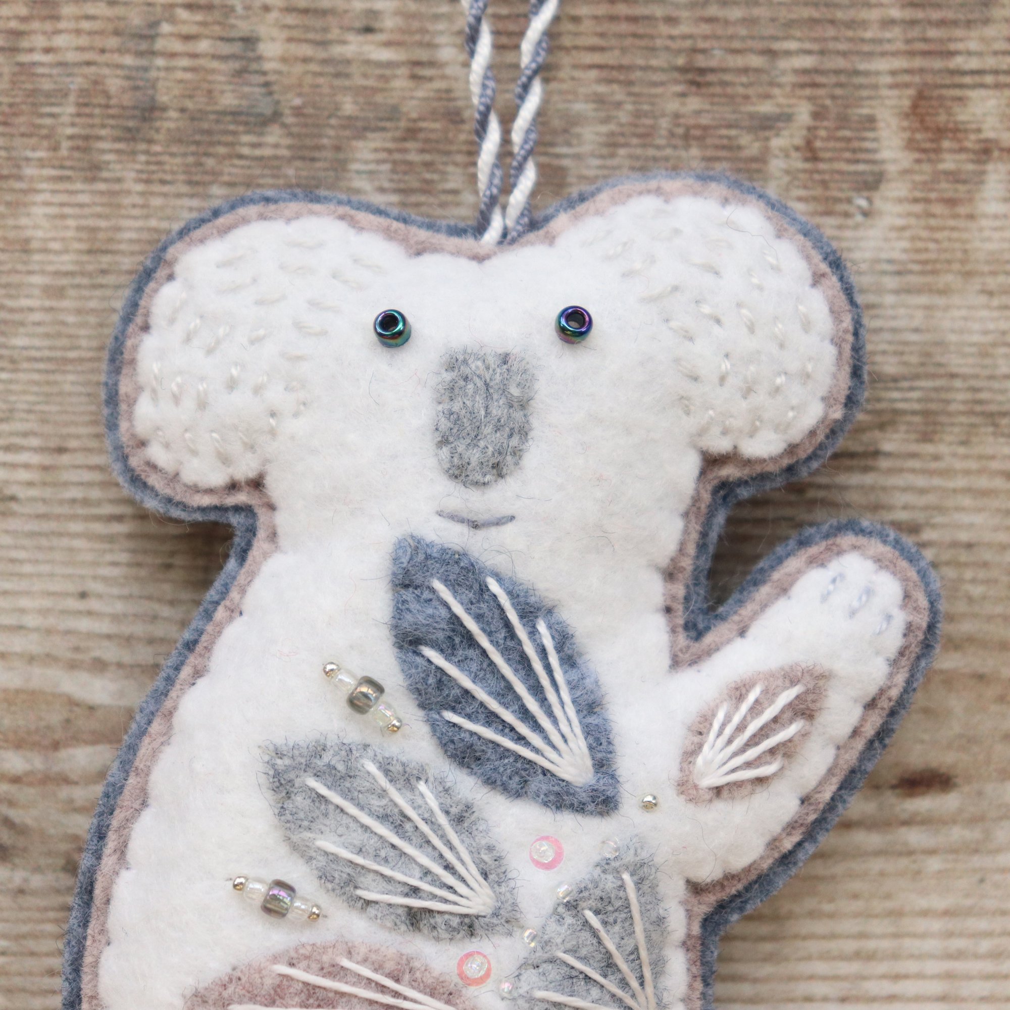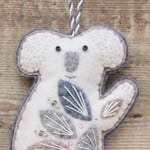 For sale here is a handmade felt koala decoration. He has been created using quality wool/ viscose blend felt in wintry colours, and embellished with hand-cut applique pieces, hand embroidery, sequins and beads. He is stuffed to give a nice padded look, backed with grey felt, and measures approximately 7cm wide by 11cm tall.