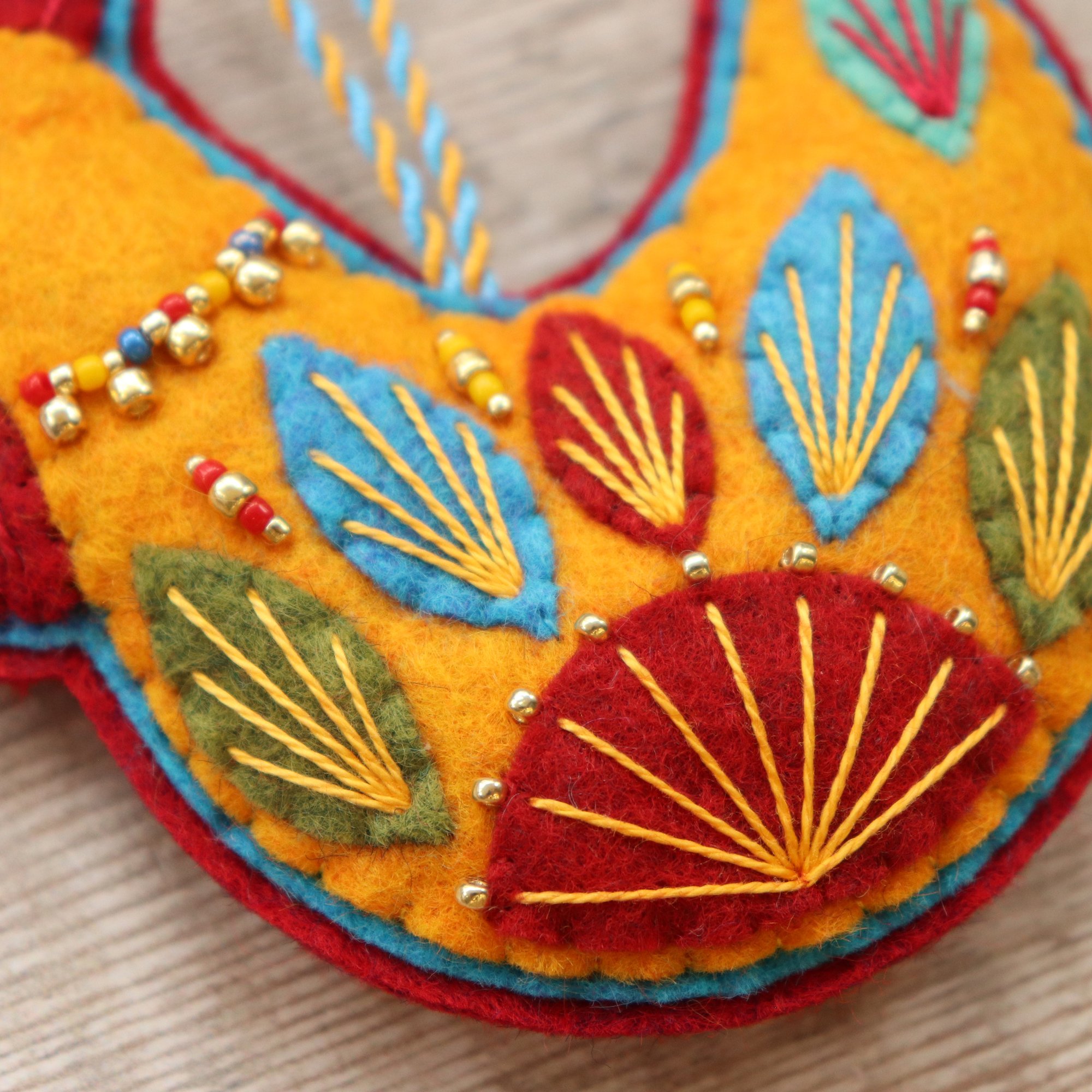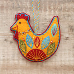 For sale here is a handmade felt hen decoration. She has been created using quality wool/ viscose blend felt in bold folk art inspired colours, and embellished with hand-cut applique pieces, hand embroidery and beads. She is stuffed to give a nice padded look, backed with deep red felt (it is a little more of a deep, plum red than it looks in the photograph) and measures approximately 9cm tall by 9cm wide.